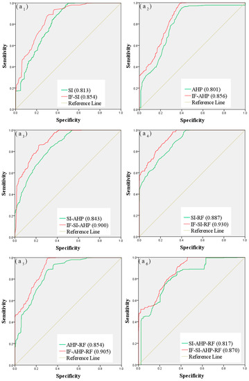 The credibility degree that was obtained by the IF method is regarded as the improved weight of each controlling factor. Then, according to the standardized weight of each grade of the controlling factors obtained by using SI, AHP, SI-AHP, SI-RF, AHP-RF, and SI-AHP-RF models, the improved weights of the controlling factors were obtained by the following formula: