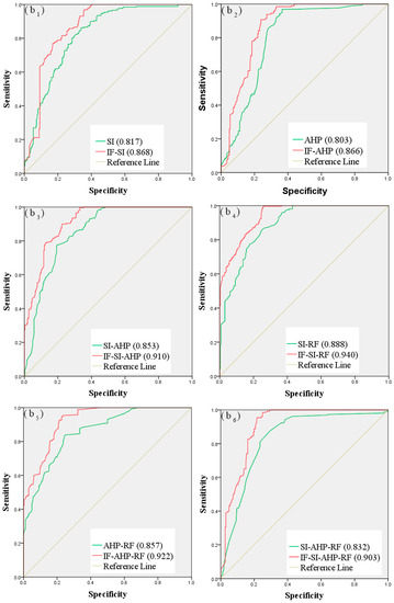 The success and prediction rates of debris flow susceptibility maps that are based on the improved controlling factors are significantly better than those that are based on the original controlling factors. As shown in Table 6, the success rates of SI, AHP, SI-AHP, SI-RF, AHP-RF, and SI-AHP-RF increased by 4.1%, 5.5%, 5.7%, 4.3%, 5.1%, and 5.3%, respectively, and the prediction rates increased by 5.1%, 6.3%, 5.7%, 5.2%, 6.5%, and 7.1%, respectively, which proves that the IF method can improve the rationality of the controlling factors. In addition, the results of six different types of models were significantly improved, which shows that the scope of application of the IF method is extensive.