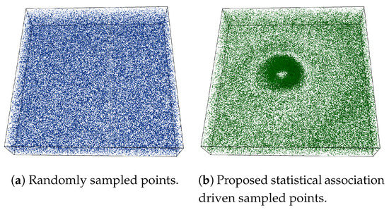 Sampling result on Isabel data set when Pressure and Velocity variables are used. (a) shows results of random sampling and (b) shows results of the proposed pointwise information driven sampling results for sampling fraction . By observing the PMI field presented in Figure 2b, it can be seen that the proposed sampling method samples densely from the regions where statistical association between Pressure and Velocity is stronger (b).