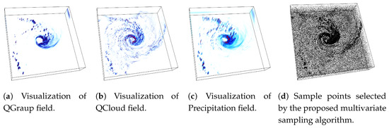An example of the proposed sampling algorithm is provided in Figure 3 using Isabel data set where Pressure and Velocity variables are used while sampling data points. The sampling fraction for this example is set to , i.e., of total data points are selected in the sub-sampled data. In Figure 3a a point rendering of the sampled data produced by the random sampling algorithm is shown and Figure 3b depicts the point samples picked by the proposed association driven sampling algorithm. It can be observed that, since given the variables Pressure and Velocity, the eyewall region of hurricane Isabel data set has a higher statistical association (as observed in the PMI field in Figure 2b), the proposed sampling algorithm selects data points densely from such multivariate feature regions to preserve the feature more accurately. Another example of the proposed sampling algorithm applied to three variables (QGraup, QCloud, and Precipitation) of Hurricane Isabel data is shown in Figure 4. Figure 4a–c provide the visualization of the raw data for the three variables respectively and in Figure 4d we show the sample points selected by the proposed multivariate sampling algorithm. Note that, since this example uses three variables together, we have used the generalized pointwise information measure, specific correlation presented in Equation (4) for computing the multivariate statistical association for the data points considering three variables. It can be seen that the cloud and rain bands show strong statistical association and as a result, more data points are selected from such regions (the dark black regions in Figure 4d).
