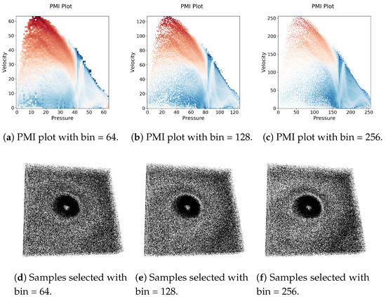 In this section, we present the results of the case studies using several scientific simulation data sets to show the effectiveness of the proposed sampling algorithm. To demonstrate the applicability of the sub-sampled data set, in this work, we employ three important analysis tasks: (1) multivariate query-driven analysis, (2) reconstruction-based visualization of sampled data sets, and (3) Multivariate correlation analysis. While computing the multivariate histograms we studied the impact of a number of bins by varying it from 64 to 256. As the number of bins increases, the multivariate histogram becomes more refined as can be seen from Figure 5a–c. In Figure 5, we show the results when different bin numbers are used for Isabel data set considering variables Pressure and Velocity. As can be seen that the pattern in the PMI plots changes only slightly, but the overall pattern remains similar. Also, from Figure 5d–f it is observed that the changes in the number of bins do not impact the proposed sampling algorithm significantly. Therefore, to maintain consistency, for all the experiments presented in this paper, we set the bin number to 128. The detailed results of the case studies are discussed below.