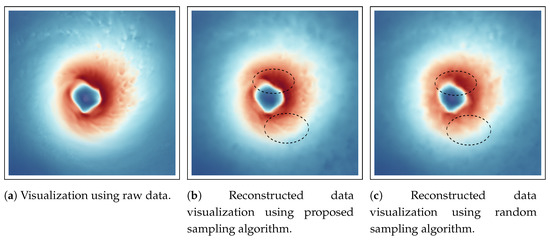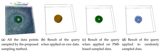 Figure 7a shows the initial set of points selected by the proposed sampling method when a sampling fraction of is used. The result of the above query when performed on the raw data is shown in Figure 7b. Figure 7c,d presents the results of the same query when performed on the sub-sampled data produced by the proposed method and on the randomly sampled data. For this experiment, the value of the sampling fraction is set to . As can be seen, the result obtained from the samples generated by the proposed sampling method (Figure 7c) generates higher quality compared to the result obtained from the randomly sampled data.