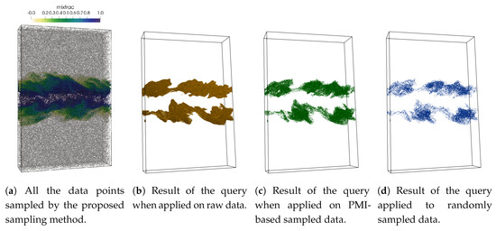 In Figure 6 the results of the above query is presented. Figure 6a shows all the sample points (sampling fraction ) that are selected initially before the query by applying the proposed information-driven sampling algorithm. The points are colored using Pressure variable. As can be seen that the information-driven sampling algorithm sampled points more densely where Pressure and Velocity show a strong statistical association. When the above multivariate query is applied on the original raw data, it returns a set of points shown in Figure 6b which is considered as the ground truth. Figure 6c provides the result of the same query when it is performed on the sub-sampled data (sampling fraction ) generated using our proposed algorithm, and in Figure 6d we show the result of the query when applied on a randomly sampled data set (sampling fraction ). It can be observed from Figure 6c,d that the proposed sampling algorithm is able to answer the query more accurately compared to the randomly sampled data set since the proposed method returns a denser set of points close to the true result shown in Figure 6b. Since the random sampling method does not consider relationships among variables while selecting data points, it is unable to preserve such important features with high fidelity and results in a sparse set of points as can be seen in Figure 6d.
