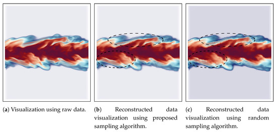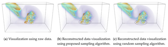 Finally, we show the reconstruction-based visualizations of tev (temperature) field in Figure 12. Sampling fraction of is used for this study. In this visualization, the dark orange regions indicate the places where the temperature value is high and is often indicative of the existence of the asteroid. This is due to the fact that as the asteroid enters the atmosphere, the temperature increases due to the friction with the atmosphere. On the lower right side, the region shows the impact of the asteroid with the surface of the water. Figure 12b shows the reconstructed image when the sampled data from the proposed method is used and by comparing it with raw data image (Figure 12a), we can observe that the reconstructed image matches quite well to the raw data image. Figure 12c shows the visualization produced using the randomly sampled data. It is seen that even though the image quality of the random sampling method is good, however, the proposed method preserves the fine structures in the image better (as highlighted by the dotted black regions) compared to the image obtained by randomly sampled data.