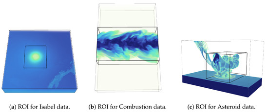 Regions of interest (ROI) of different data sets used for analysis. (a) shows the ROI in Isabel data set, where the hurricane eye feature is selected. (b) shows the ROI for Combustion data set, where the turbulent flame region is highlighted. Finally, in (c) the ROI for asteroid data set is shown. The ROI selected in this example indicates the region where the asteroid has impacted the ocean surface and the splash of the water is ejected to the environment.