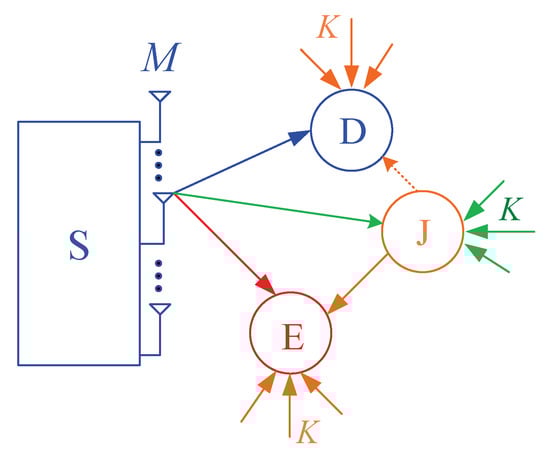 Figure 1 illustrates the system model of the proposed protocol, where the source node (S) equipped with M antennas communicates with the single-antenna destination (D), in presence of the single-antenna eavesdropper (E) who attempts to overhear the source data. All of the receivers such as D and E are suffered from co-channel interference caused by K ambient sources (denoted by ). To reduce the quality of the eavesdropping link, the cooperative jamming technique can be used, where the single antenna jammer (J) is employed to continuously generate the artificial noises to E. We assume that the nodes D and J are close with each other so that D can remove the co-channel interference generated by J []. Moreover, the jammer (J) uses the energy harvested from the RF signals of the source and the interference sources for transmitting the jamming signals.