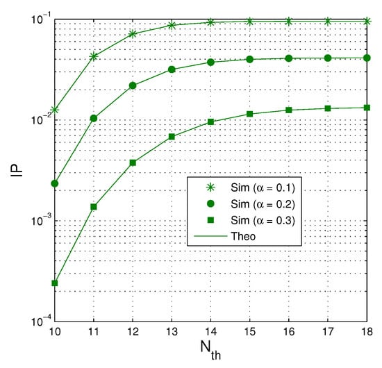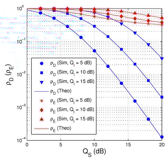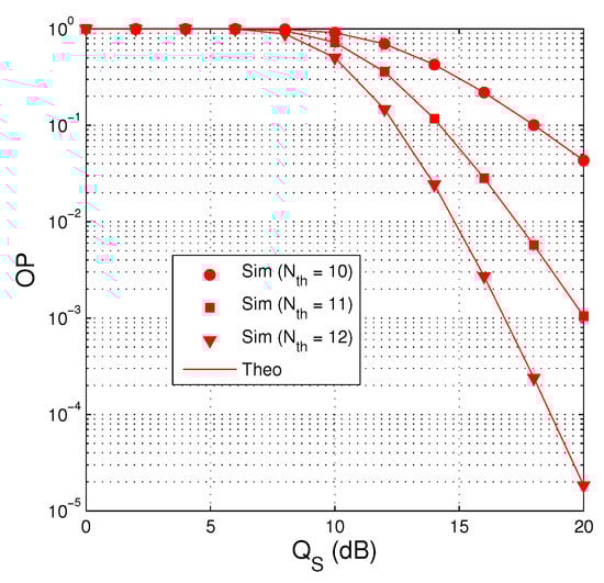 In this section, Monte Carlo simulations are presented to verify the theoretical results. For illustration purpose, in all of the simulations, we fix the required number of the encoded packets by 10 , the energy conversion efficiency by 1 , the total block time by 1 , the number of the interference sources by 3 , the parameters of the interference links by , and , and the parameters of the remaining links by 1 . In the figures, the simulation and theoretical results are denoted by Sim and Theo, respectively.