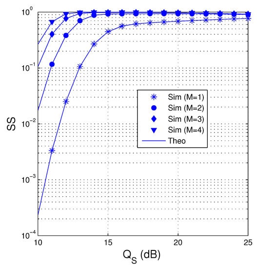 In Figure 4, we present the value of SS as a function of in dB when dB , , , , and . We can see that the proposed protocol obtains higher value of SS when more antennas are equipped at the source. It is also seen that when , the SS performance is significantly degraded because no transmit diversity gain is obtained. Moreover, SS also increases as increasing . It is due to the fact that at high values, the destination almost obtains sufficient number of the encoded packets before the eavesdropper. However, it can be seen from Figure 4 that when the value of is very high, the value of SS slightly decreases due to high overhearing possibility of the eavesdropper. Moreover, the SS performance in all values of is almost same at high regimes.