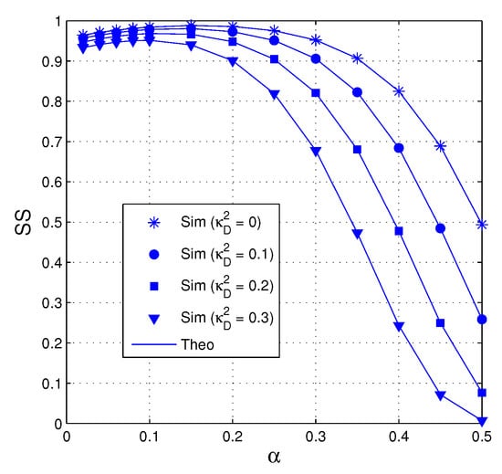 In Figure 5, the value of SS is presented as a function of when dB, , , and . As we can see, the performance significantly degrades with high hardware impairment levels of the data links, i.e., is high. Moreover, we can observe from that the fraction of time allocated for the EH phase impacts on the value of SS. It can be seen that there exists an optimal value of at which the value of SS is highest.