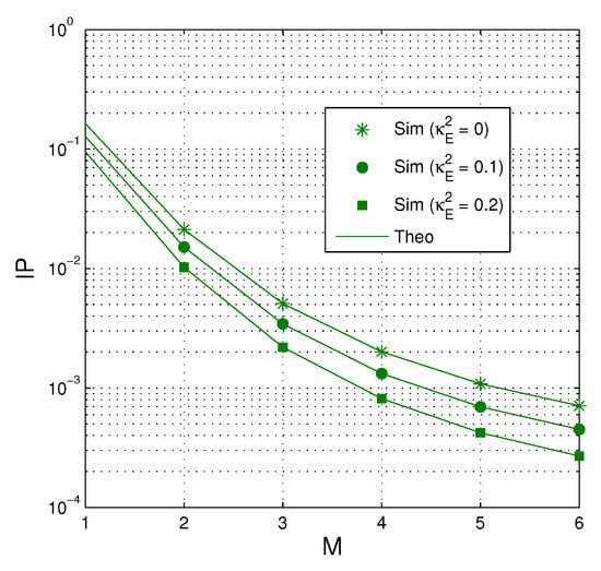 In Figure 6, the intercept probability of the proposed protocol is presented as a function of M when dB, , , and . As we can see, the value of IP decreases when more antennas are equipped at the source. Also, IP is lower when the hardware impairment level of the eavesdropping links is high.
