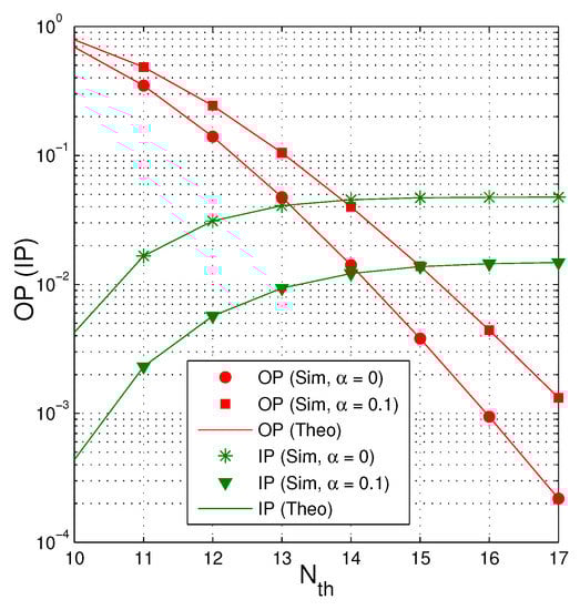 Figure 8 presents OP and IP as a function of when dB, , and . We can see that there exists a trade-off between OP and IP. Indeed, OP increases when increasing the value of , while IP decreases with higher value of . We can also see that when , OP is below when the value of is higher than (about) 0.15, but the intercept probability is higher than . In addition, OP significantly decreases as decreasing the value of .