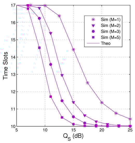In Figure 10, we present average number of the time slots as a function of in dB when dB, , , and . We see that the number of time slots used decreases when increasing the number of antennas and the transmit power of the source. It is also seen that as the source has a single antenna (), the average number of time slots is much higher. Moreover, reducing the number of time slots means reducing the delay time and transmit power, which are an important metric of wireless communication systems.