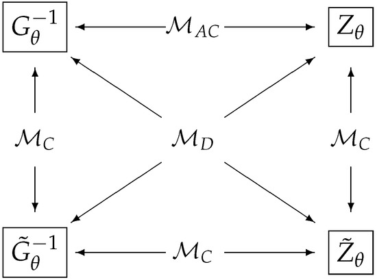 A schematic diagram for model classification for three classes: the classical (), D-invariant (), and asymptotically classical () in terms of four matrices . Two arrows in the opposite direction indicate if two matrices are identical, and the model belongs to a class indicated between these arrows.