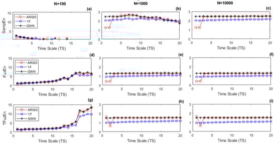- at N = 1000, SampEn (Figure 1b) lost consistency in long scales (TS ≥ 10), which was evidenced specially in GWN and AR025 signals where the entropy value, that was higher than 1/f signal for N = 10,000, now was equal or lower that 1/f signal for N = 1000. On the contrary, all the fuzzy approaches (Figure 1e,h,k,n) showed a relative consistency for all the synthetic series at any time scale TS. TFuzEn (Figure 1h) and ITFuzEn (Figure 1n) continued showing a kind of ripple for the AR025 series between TS = 1 and TS = 2;