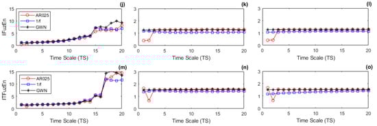 - at N = 10,000, FuzEn (Figure 1f), and IFuzEn (Figure 1l) had a similar behavior of SampEn (Figure 1c) for all the synthetic time series, but the courses of TFuzEn (Figure 1i) and ITFuzEn (Figure 1o) showed a different behavior for the AR025 series, particularly in TS = 1 where the entropy value was higher than TS = 2, presenting a kind of ripple.