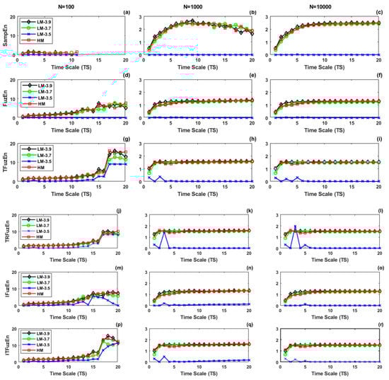 - at N = 1000: (i) SampEn (Figure 2b) lost consistency in long scales (TS ≥ 10), which was evidenced specially in the LM-3.9 signal where the entropy value, that was higher or equal than the other signals for N = 10,000, now was lower than LM-3.7 and HM signals at long scales for N = 1000; (ii) all the fuzzy approaches (Figure 2e,h,k,n,q) showed a relative consistency for all the synthetic series at any time scale TS; (iii) only SampEn and FuzEn (Figure 2e) showed zero value for LM-3.5 in all the time scales; (iv) TFuzEn (Figure 2h), TRFuzEn (Figure 2k), IFuzEn (Figure 2n), and ITFuzEn (Figure 2q) continued showing a ripple in the course of LM-3.5;
