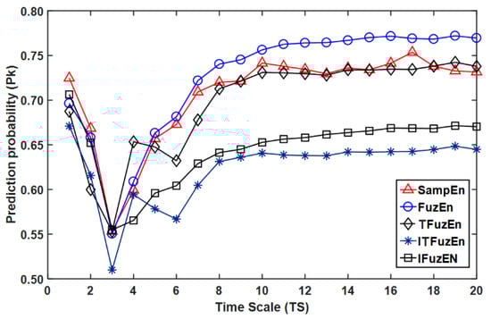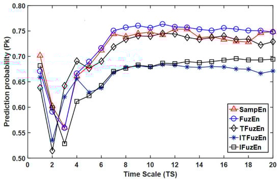- For short scale (TS = 1), the best Pk value was for SampEn, followed by IFuzEn and FuzEn. The lowest Pk values were obtained at TS = 3 for all the approaches in Figure 3 (2 ≤ RSS ≤ 5 vs. RSS = 6), while, for Figure 4 the lowest Pk were at TS = 2 for ITFuzEn, TFuzEn and TRFuzEn, and at TS = 3 for SampEn, FuzEn, and IFuzEn.
