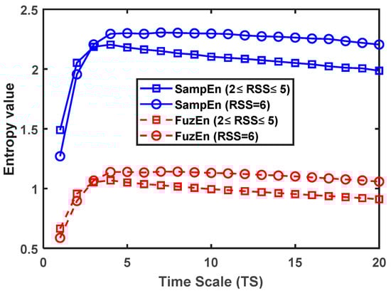 - SampEn showed higher entropy values than FuzEn in all the scales for both groups (2 ≤ RSS ≤ 5 and RSS = 6).