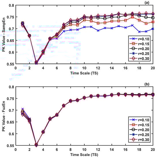 - When SampEn was computed (Figure 6a), the Pk values were almost equal at short scales (1 ≤ TS ≤ 5) for all the values of the parameter r, but not for long scales.