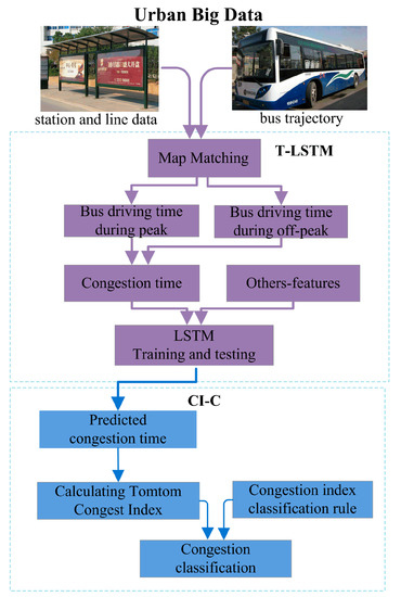 In this paper, we propose a method of traffic congestion prediction based on bus driving time (TCP-DT) to improve prediction accuracy during the peak periods of the working day. We chose the driving time of buses between two bus stations to predict the traffic congestion level of the road section, because the speed of buses is relatively stable compared with the floating speed of cars, and their driving regularity is strong. The period from 11:00 to 13:00 in the off-peak period on a sunny day is considered to be the non-congestion driving time. In the TCP-DT, (1) a map-matching method is adopted to match the bus location with the bus station location, and then the driving times of different road segments in the morning and evening peak periods are extracted; (2) the weather and labels of congestion times are converted into one-hot code, which is aggregated into input data with the historical congestion times, and the congestion time prediction based on the long short-term memory (T-LSTM) model is used to train and predict future congestion times [11,12,13]; and (3) the congestion index and classification (CI-C) model is adopted to calculate the traffic congestion index of different road sections by using the predicted congestion time. Finally, we evaluate the performance of the classification methods based on information entropy [14,15].