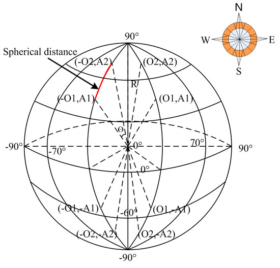 To adjust the longitude and latitude range from 0° to 180°, first, assume that the latitude and longitude of 2 points are (O1, A1) and (O2, A2), respectively. According to the benchmark of 0° longitude: