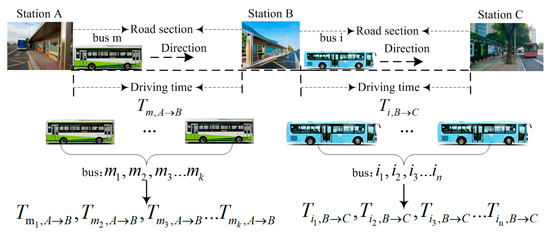 Figure 3 shows the process of buses driving from one station to another. Driving time is defined as the interval between departure time at one station and arrival time at the other station. The time intervals of bus driving from station A to station B are denoted as , respectively. Similarly, the time intervals from station B to station C are defined as . Then, driving time is defined as , and the calculating equation is as follows: