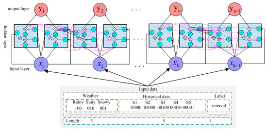 The input is composed of weather and historical data. Firstly, the peak period is divided into morning and evening peaks; morning peak is from 07:00 to 09:00, and evening peak is from 17:30 to 19:30. Secondly, the weather is divided into rainy, sunny, and snowy, which is encoded into a 3-bit one-hot code. Thirdly, the historical congestion times of buses in specific sections are divided into five segments, which are converted into 5-bit one-hot codes. The values of congestion times are regarded as labels. Finally, all features are aggregated to form the input data, which has dimensions of .