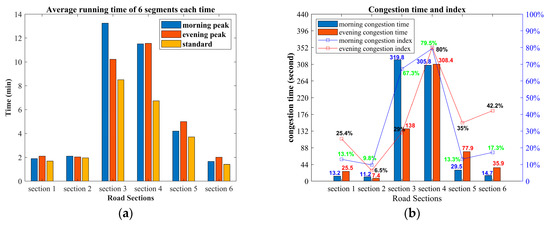 (a) Average driving time of six road sections; (b) distribution of congestion time and index.