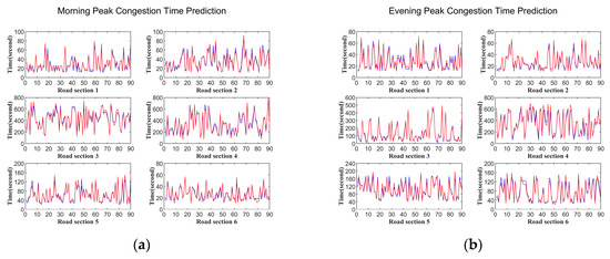 To better illustrate the experimental results, we extracted 90 congestion times for each road section to show the predicted results. Figure 7 depicts the predicted and real congestion times of the six road sections during morning and evening peak periods. The red curve depicts the real congestion times of buses in the six road sections, and the blue curve represents the predicted congestion times. From the picture, we can see that the changing trend of the predicted value curve is very close to the real value curve, which indicates that the predicted curve can reflect the change of real values perfectly.