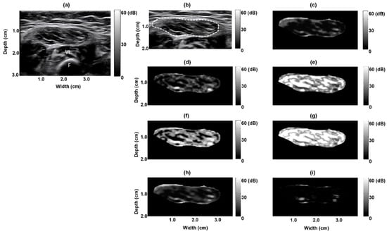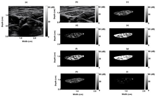 Texture-feature parametric imaging of a pathological sartorius muscle in a five month old boy with late-onset Pompe disease. (a) Original B-mode image, (b) extracted sartorius muscle region (indicated by the white dashed line) in the B-mode image, (c) autocorrelation image, (d) contrast image, (e) energy image, (f) entropy image, (g) maximum probability image, (h) variance image, and (i) cluster prominence image.