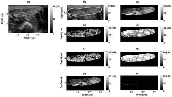 Texture-feature parametric imaging of a normal rectus femoris muscle in a 12 month old boy. (a) Original B-mode image, (b) extracted rectus femoris muscle region (indicated by the white dashed line) in the B-mode image, (c) autocorrelation image, (d) contrast image, (e) energy image, (f) entropy image, (g) maximum probability image, (h) variance image, and (i) cluster prominence image. F: femur bone reflection, VI: vastus intermedius muscle.