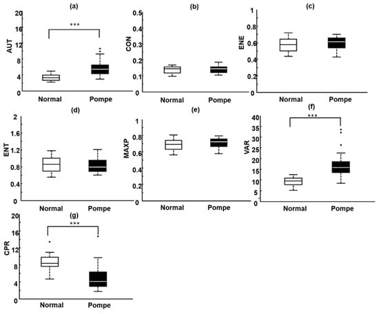 Box plots of the distributions of the seven parameters for normal rectus femoris muscles and pathological rectus femoris muscles affected by Pompe disease. (a) AUT: autocorrelation; (b) CON: contrast; (c) ENE: energy; (d) ENT: entropy; (e) MAXP: maximum probability; (f) VAR: variance; (g) CPR: cluster prominence; *** p < 0.001.