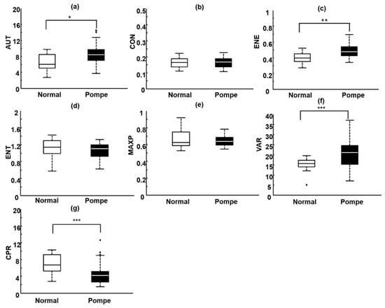 Box plots of the distributions of the seven parameters for normal sartorius muscles and pathological sartorius muscles affected by Pompe disease. (a) AUT: autocorrelation; (b) CON: contrast; (c) ENE: energy; (d) ENT: entropy; (e) MAXP: maximum probability; (f) VAR: variance; (g) CPR: cluster prominence; * p < 0.05; ** p < 0.01; and *** p < 0.001.