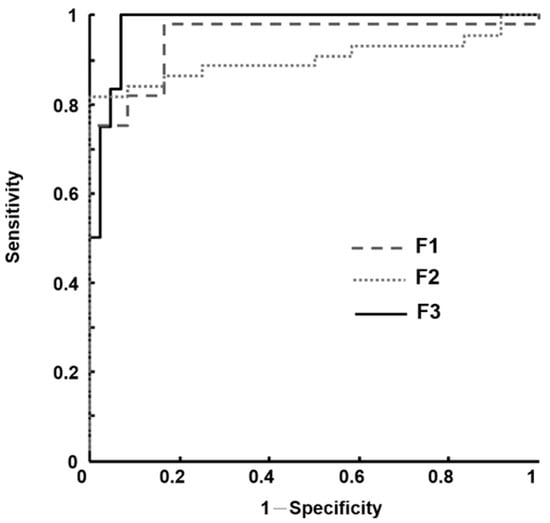 Receiver operating characteristic (ROC) curves of each feature set. F1: comprising the variance and cluster prominence for rectus femoris muscles. F2: comprising the energy, variance, and cluster prominence for sartorius muscles. F3: constituting a combination of F1 and F2.