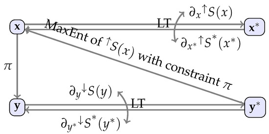 A summary of static MaxEnt highlighting relations between state variables on the higher level and the lower level of description and their conjugates. MaxEnt provides lower entropy and a relation from composition of and . LT denotes a relation via Legendre transformation, stands for a projection from the microscale to the macroscale variables and by an arrow we depict a mapping (written above or below the arrow) that relates the variables in the connected nodes.