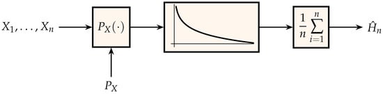 The output estimate, , of the scheme in Figure 1 is consistent, i.e., it converges to the entropy, because of the law of large numbers. Unfortunately, it has no practical utility as an empirical estimator of entropy since it requires knowledge of . Nevertheless, the scheme in Figure 1 suggests a two-pass algorithm for estimating the entropy of samples drawn independently from an unknown distribution by replacing the unknown in the left block with its empirical estimate computed from the n observations :