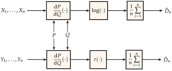 In the same spirit as Figure 1, Figure 3 shows two estimators of the relative entropy between the probability measures that generate the independent identically distributed sequences and . The middle block in the bottom estimator is the nonnegative function