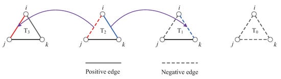 Other researchers, considering the amount of information that a node holds, proposed some “global” and “local” sign adjustments, including add and delete mechanisms [,]. Under a global adjustment mechanism, individuals are all granted information about the whole network and can take this into account in their sign adjustments. However, under local mechanisms, individuals can only assay the factors in their local neighbourhood [,]. Local angle- or information-based sign adjustment mechanisms often cause global turbulence and imbalance in the network.