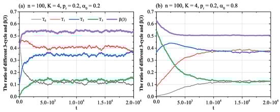The evolution ratio of different three-cycles in the Newmann-Watts (NW) network under the sign random adjustment rule. The horizontal axis is the simulation time t. The vertical axis gives the ratio of three-cycles. The sampled plot in (a) gives the results for a NW network with parameters , , , and . In (b), the network parameters are , , , and .