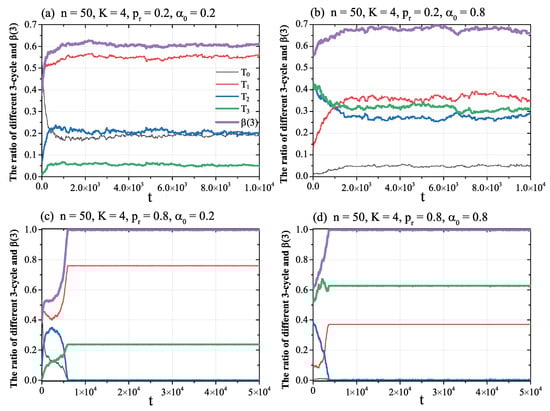 The evolution ratio of different 3-cycles in the NW network under the minimum memory-based sign adjustment rule. The horizontal axis is the simulation time t. The vertical axis gives the ratio of three-cycles. (a) shows the results for a NW network with parameters , , , and ; (b) is a network with , , , and ; (c) gives the results for a NW network with , , , and ; and (d) is a network with , , , and .