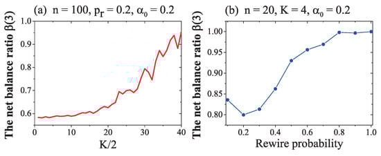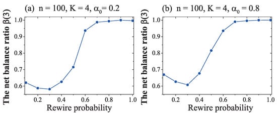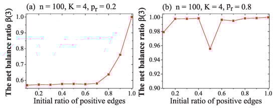 (1) In Figure 4a, where the rewire probability was , if the initial ratio of positive links was less than about 0.7, the NW network converged to an imbalanced steady state, , and could not converge to a global balance . If , the convergent value of increased. The bigger the value of , the greater of balance ratio was. The reason for this is that, while , the NW network initially had more positive links, and global balance was possibly close to the initial state.
