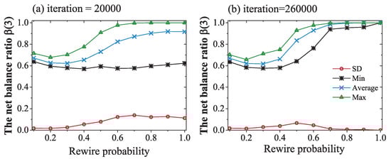 (2) When the simulation time was short and rewire probability small, as shown in Figure 7a, the network converged quickly, for there were fewer links and triangles in the network. The standard deviation was lower, and the maximum, average, and minimum values were very close. With increased rewire probability, the standard deviation enlarged and the gap between the maximum and minimum values expanded. With , some lucky networks had already reached a global balance , as shown by the yellow dashed line; however, some unlucky networks were still imbalanced, and could not reach a global balance, even when the rewire probability was near unity. The randomness in the sign adjustment process could not ensure that every triangle became balanced.