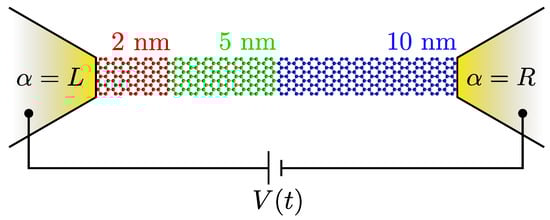 - Tuovinen, R.; Perfetto, E.; Stefanucci, G.; van Leeuwen, R. Time-dependent Landauer-Büttiker formula: Application to transient dynamics in graphene nanoribbons. Phys. Rev. B 2014, 89, 085131. [Google Scholar] [CrossRef]
