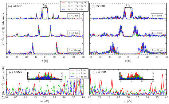 - From the full frequency ranges of the Fourier transforms (insets), we observe a high-frequency operational cut-off which is smaller for the ZGNR case than for the AGNR case. This is itself an interesting effect, as it sets a limit on switches built with these kind of nanoribbons [,].