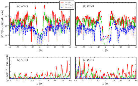 As we have now established general principles for the traversal times, we concentrate our discussion on disordered GNRs of fixed length and fixed applied (time-independent) voltage. In Figure 3, we introduce disorder into the GNR without breaking chiral symmetry. This is done by drawing a random number from a uniform distribution of width w around the average hopping matrix value . We exclude second and third nearest neighbour hoppings, and we consider randomness only in the hoppings, for we wish to preserve particle–hole symmetry [,]. We see that the disorder appears to increase the traversal time and also has the effect of decreasing the quality of the signal, so that multiple side-peaks are visible. These are caused by internal reflections induced by the disorder. In addition, the intrinsic resonant frequencies for the disordered GNRs (shown by the Fourier spectra) are red-shifted due to the hopping disorder. This finding is consistent with the idea of reduced operational frequencies for the GNR devices due to disorder.