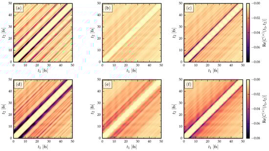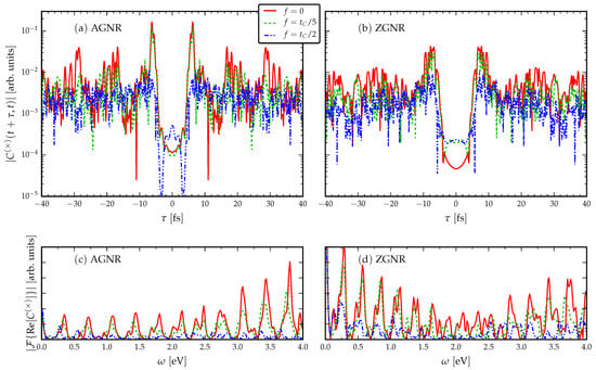 where the static part is set by and the amplitude of the ac driving is with the driving frequency . To reduce the computational effort, we consider only the short nanoribbons in this case ( nm). In Figure 5, we show the propagation of the full two-time cross-correlation from the initial time . AGNR data are shown in Figure 5a–c and ZNGR data are shown in Figure 5d–f. In contrast to the previous steady state results, here we show the initial transient (up to 50 fs), which includes relaxation effects.