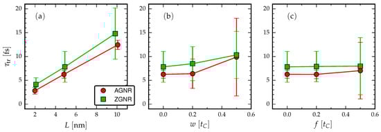 We have employed the recently developed TD-LB formalism to compute the two-time current correlation functions for disordered GNRs. This methodology is a fast and accurate way of addressing mesoscopic quantum transport phenomena out of equilibrium as it is well-supported by the underlying nonequilibrium Green’s function theory []. By our analysis, we confirm that the current cross-correlation is a good measure of electron traversal time. We find that the traversal time scales roughly linearly with the length of the GNRs, and that the traversal time also depends strongly on the GNR orientation. In general, the results presented in our work indicate that the traversal time can be most sensibly connected to the group velocity of noninteracting electrons passing through the graphene nanoribbon. The distance between the first maxima in the cross-correlations corresponds to the time for an electron with velocity nm/fs to cross the ribbon. This velocity is consistent with the value of the Fermi velocity in graphene where Å is the carbon–carbon distance []. This can be related to the Büttiker–Landauer time for tunnelling [] through a rectangular barrier as the time it would take a particle with velocity to traverse the barrier.