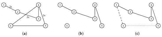 At this stage, the first part of Equation (5) is completed. The operation ⊕ adds to the result the edge ( X 0 2 ) 1 , { 6 , 1 } chosen from the previous particle position set. To complete the set to form the Hamiltonian cycle, the nearest-neighbor heuristic is used, and the edge 1 , { 5 , 6 } is selected. The final particle position is: