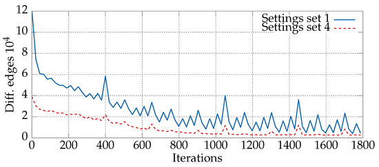 Figure 3. Numbers of new (different) edges between X k 1 and X k (the previous and current positions) in the DPSO solving the static kroA200 TSP instance (200 cities). The blue line indicates the particles with the first set of values from Table 2 (Setting 1), and the red line is for the more “stable” particles for which the fourth set (Setting 4) of parameter values was used. The remaining parameters were taken from Table 3. The values were averaged over 30 runs of the algorithm.