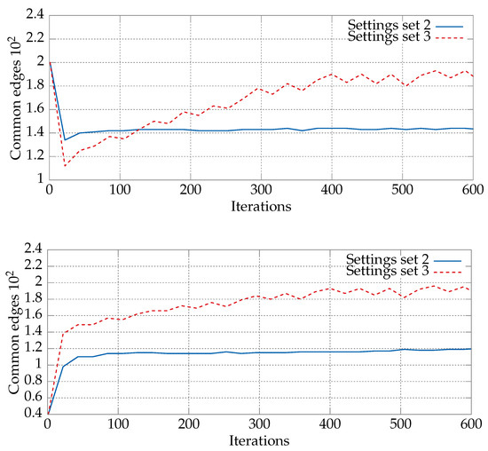 The first and fourth sets of parameter values from Table 2 differ in terms of the dynamics of changes in the number of common edges between the current and previous positions of the particle. For the small parameter values taken from the first set, the probability of edge selection to the next position (p) is very small and can only be increased if the corresponding pheromone has a high value. On the other hand, in the fourth set of parameters, c 3 has the highest value from the range. As a result, the edges from the previous position will be added to the next position of the particle with high probability. Both characteristics can be clearly seen in Figure 3. The blue line is below the red one, which means that the position of the particle from the first set has more changed edges.